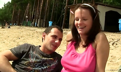Alluring amateur brunette giving fancy boob job before getting her shaved pussy nailed in close up shoot outdoor