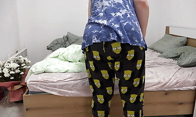 schoolgirl in pajama with small fun bags masturbate shaved horny pussy and gigantic squirt orgasm