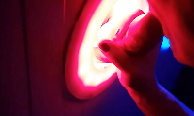 Horny hot ass dame love giving huge dick handjob thru glory hole