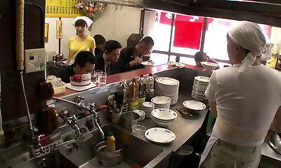 Kitchen maid in Asia Store gets fucked by every man in the Shop