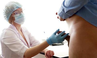 Big-boobed Doctor stroking the prostate. Stuck her finger up the ass